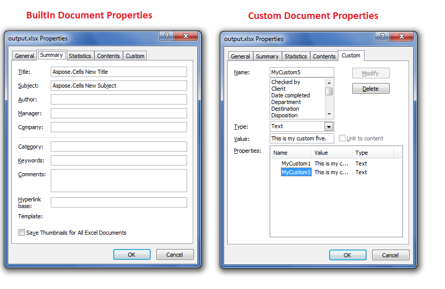Der folgende Beispielcode lädt die Beispieldatei Excel und liest die eingebauten Dokumenteigenschaften, z.B. Titel und Betreff, und ändert sie. Dann liest es die benutzerdefinierte Dokumenteigenschaft MyCustom1 und fügt eine neue benutzerdefinierte Dokumenteigenschaft MyCustom5 hinzu und schreibt die Ausgabedatei Excel. Der folgende Screenshot zeigt die Wirkung des Beispielcodes auf die Beispiel-Excel-Datei.