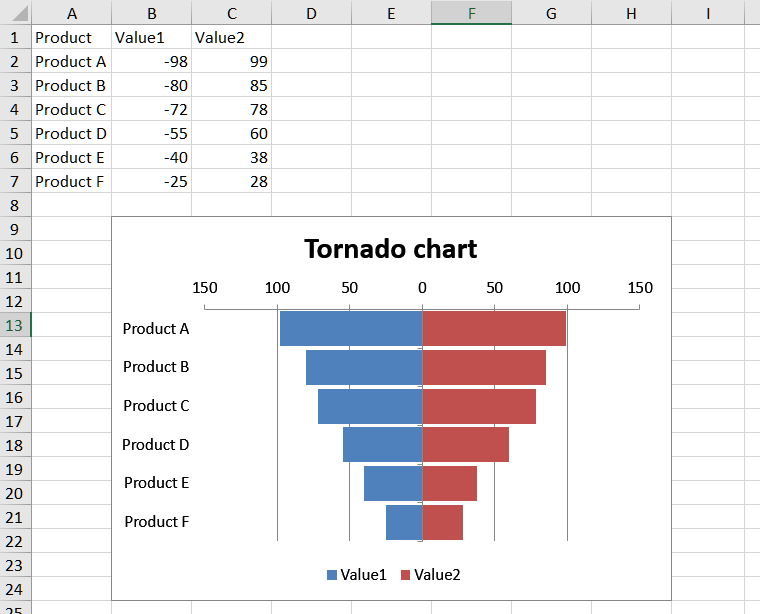 Por favor, consulta el siguiente código de muestra. Carga el archivo de Excel de muestra que contiene algunos datos de ejemplo. Luego, crea el gráfico de barras apiladas basado en los datos iniciales y establece propiedades relevantes. Finalmente, guarda el libro de trabajo en formato XLSX de salida. La siguiente captura de pantalla muestra el gráfico tornado creado por Aspose.Cells en el archivo de Excel de salida.