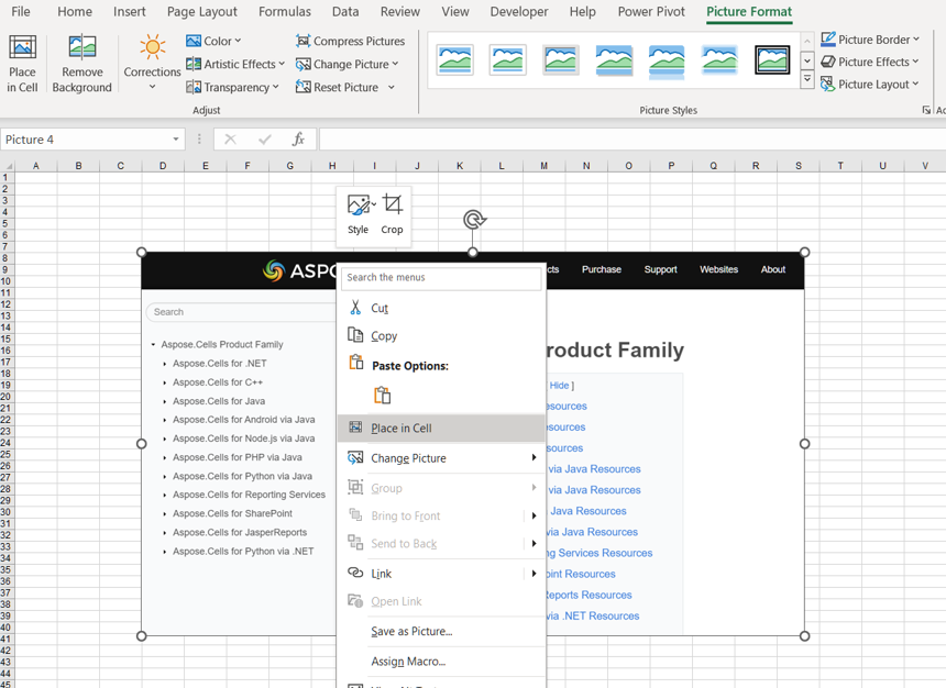 - Haga clic derecho en la imagen y seleccione Insertar en celda.