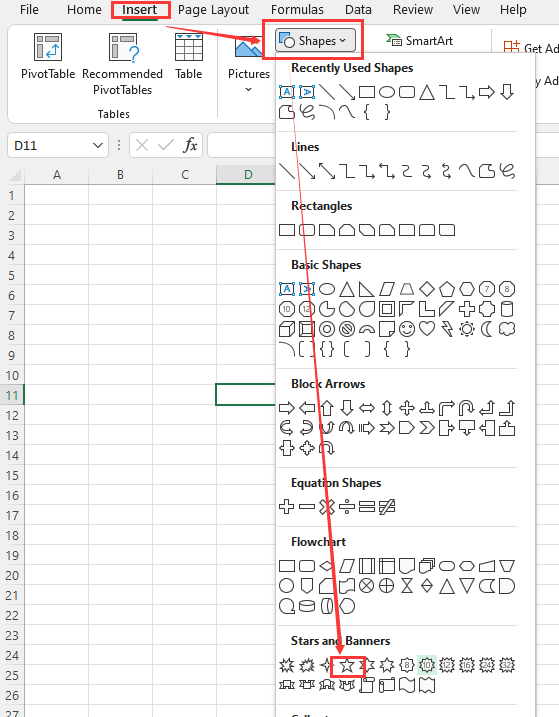 - Ensuite, sélectionnez l’étoile à cinq branches dans Étoiles et Bannières