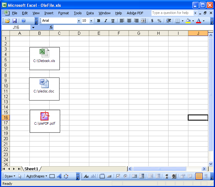 - Ajoutez un document Microsoft Word, un classeur Excel et un document PDF en tant qu’objets OLE sur la première feuille de calcul.