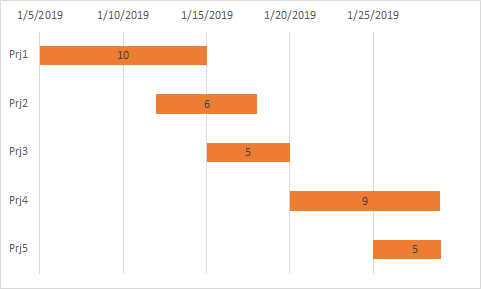 Veuillez voir l’exemple de code ci-dessous. Il charge le fichier Excel d’exemple qui contient des données d’exemple. Il crée ensuite le graphique à barres empilées basé sur les données initiales et définit les propriétés pertinentes. Enfin, il enregistre le classeur au format XLSX de sortie. La capture d’écran suivante montre le graphique de Gantt créé par Aspose.Cells pour Python via .NET dans le fichier Excel de sortie.
