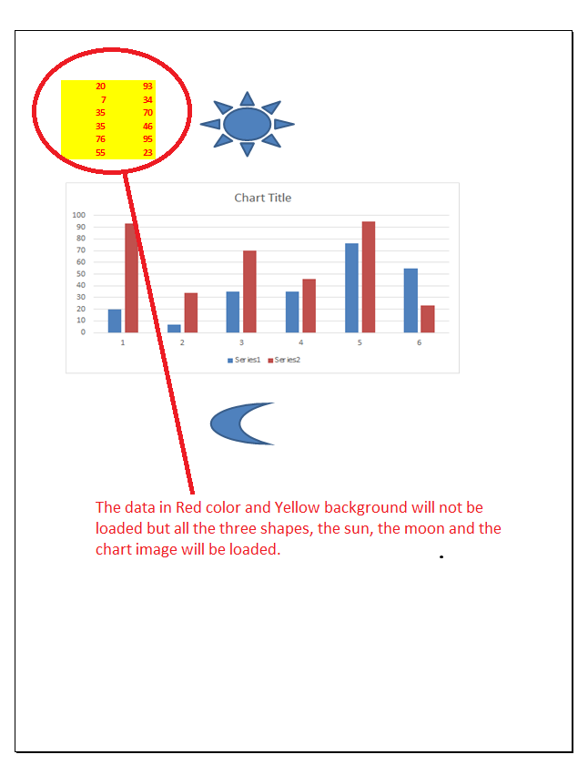 Il codice di esempio seguente carica solo gli oggetti di forma durante il caricamento della cartella di lavoro dal file di modello che è possibile scaricare dal link fornito. Lo screenshot seguente mostra i contenuti del file di modello e spiega anche che i dati di colore rosso e sfondo giallo non saranno caricati perché la proprietà LoadOptions.load_filter è stata impostata su LoadDataFilterOptions.SHAPE