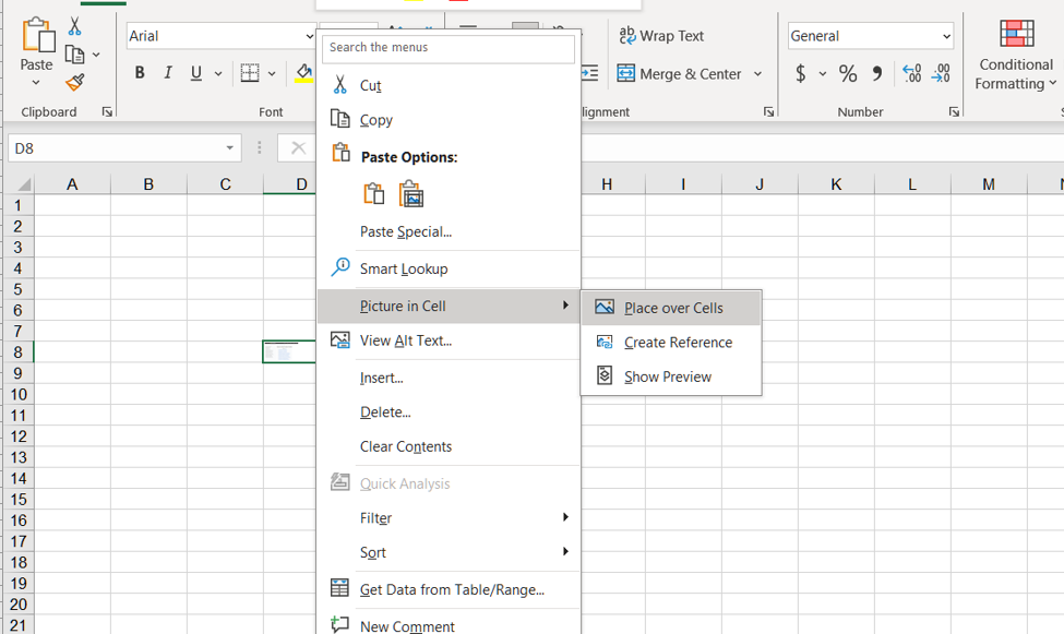- セルを右クリックし、画像内にセル > セルの上に置く を選択します。