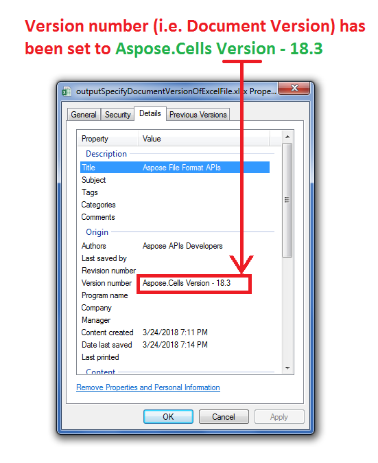 Excelファイルのバージョン番号を変更するには、ファイルを右クリックし、[プロパティ]→[詳細]を選択し、バージョン番号の欄を編集してください。Aspose.Cells APIを使ってプログラムで変更するにはBuiltInDocumentPropertyCollection.GetDocumentVersion()プロパティを使用してください。