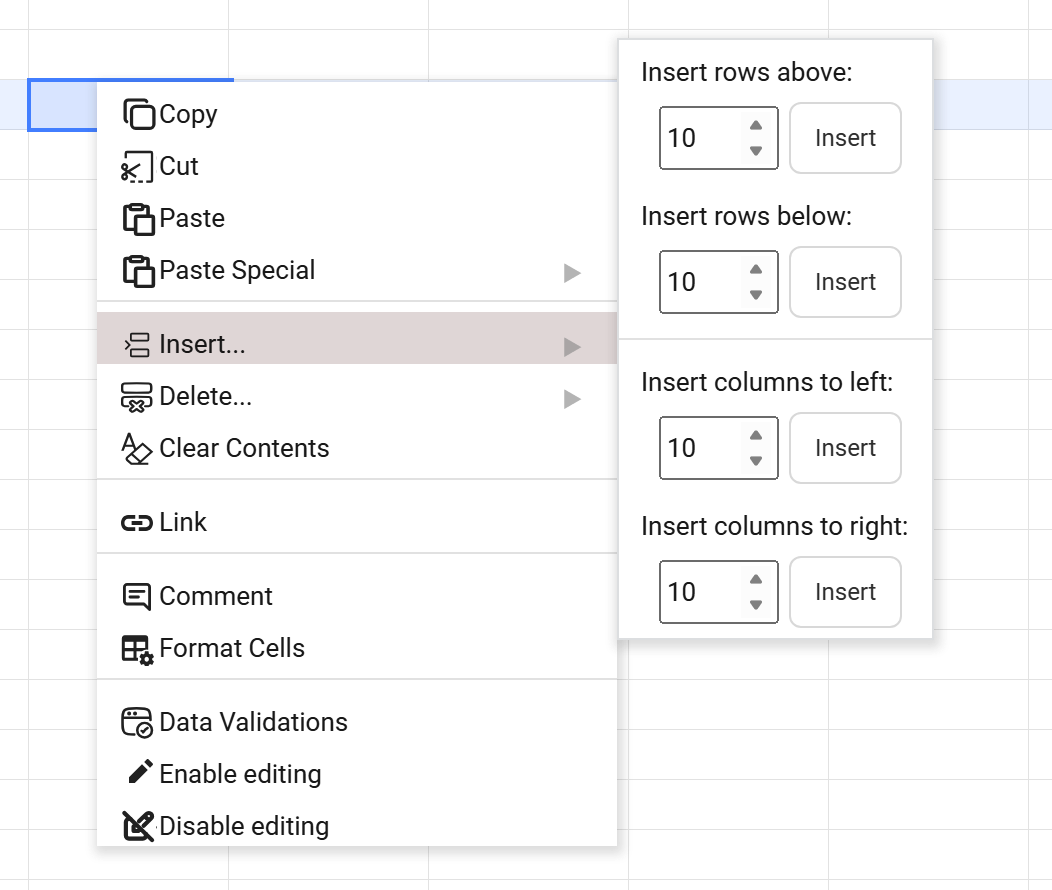 Q: Why do I only see row-related or column-related insert options in some cases? A: Context menu mode switches by selection type. In row/column header mode, submenu items are filtered to matching row or column operations.