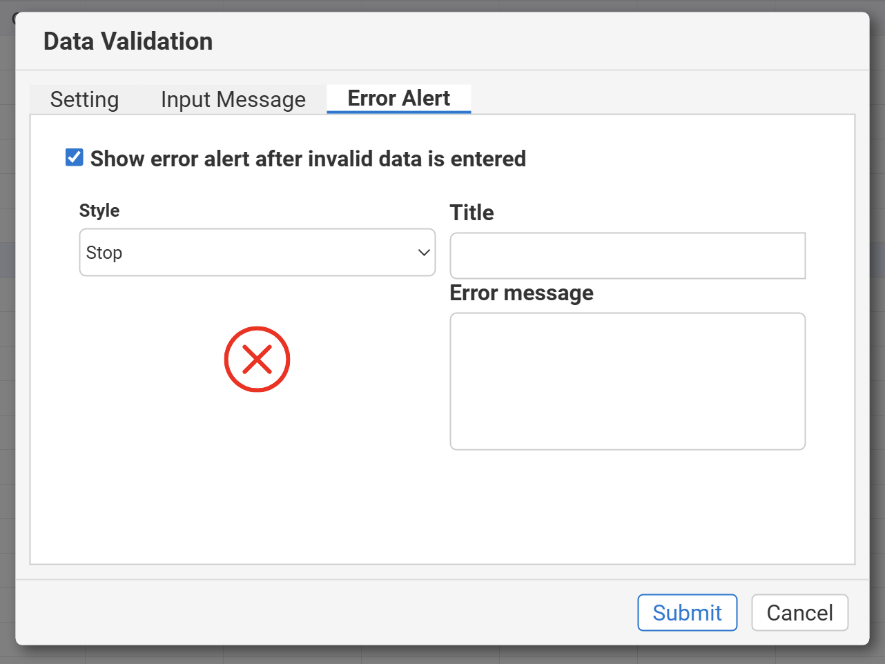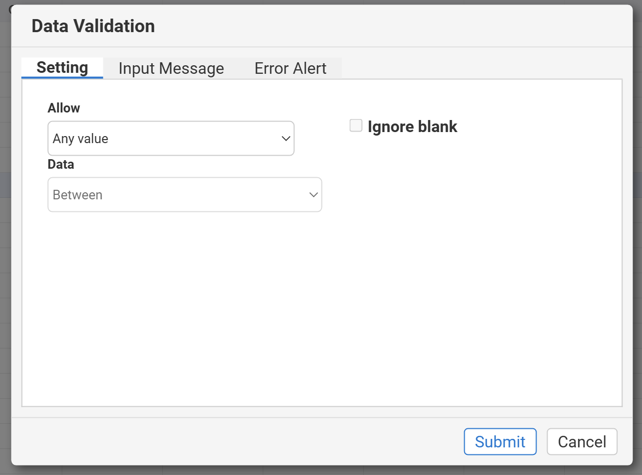 Data validation helps ensure that users enter only allowed values in cells. GridJs provides a full‑featured modal dialog where you can define the rule type, specify the target range, and customize helpful messages and error alerts.