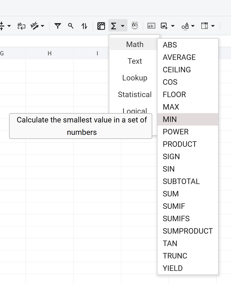 - To insert a function template directly, click Functions on the toolbar and pick a function. The selected cell receives