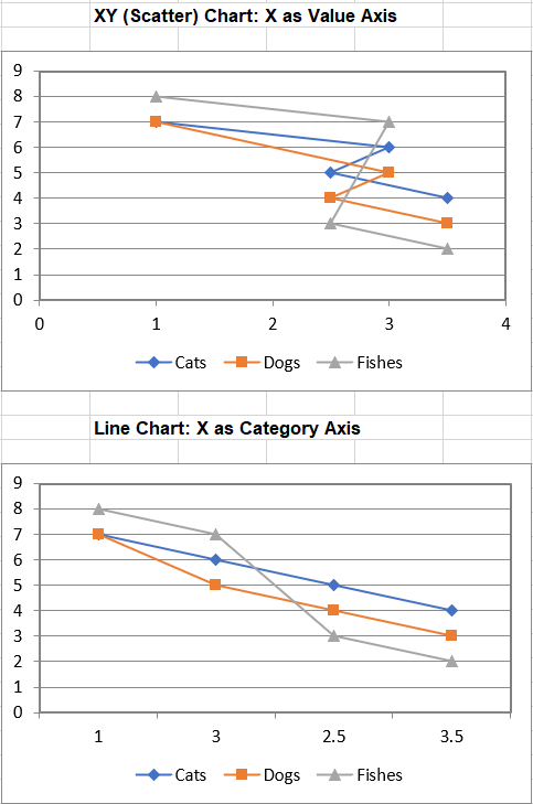 We will display this data on two types of charts: the first chart is an XY (Scatter) chart with X as a Value Axis, and the second chart is a line chart with X as a Category Axis.