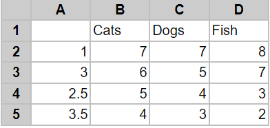 Our sample data is shown in the sample table file below. The first column contains our X‑axis data, which can be treated as Categories or as Values. Note that the numbers are not equally spaced, nor do they even appear in numerical order.