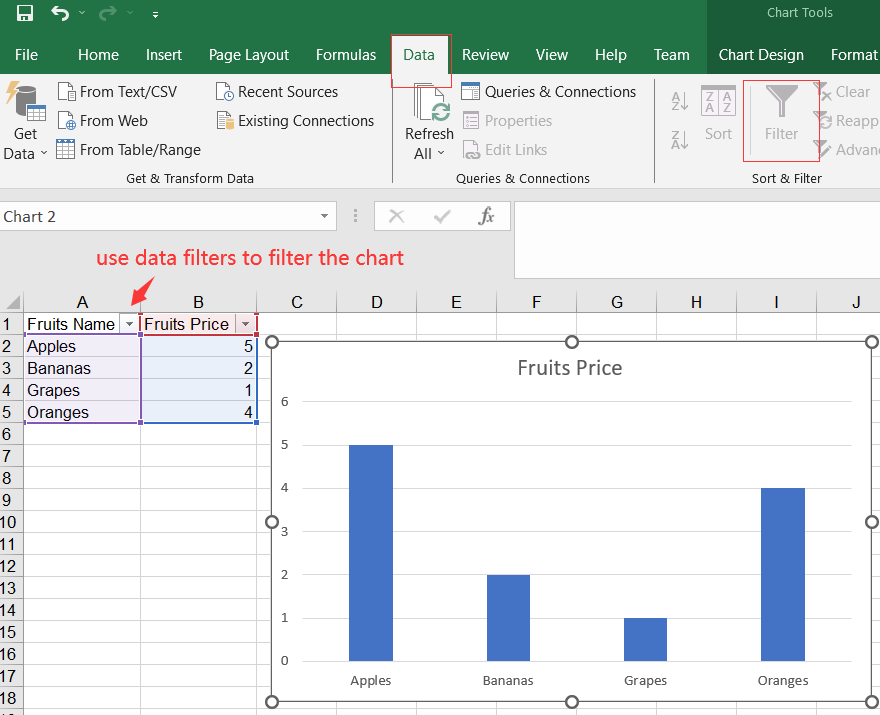 - Теперь отфильтруйте свои данные, используя выпадающие стрелки в данных. Не используйте фильтры диаграммы.