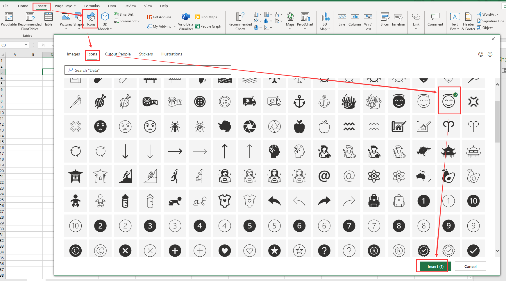 Интерфейс Excel, соответствующий операции вставки значка, выглядит следующим образом:
