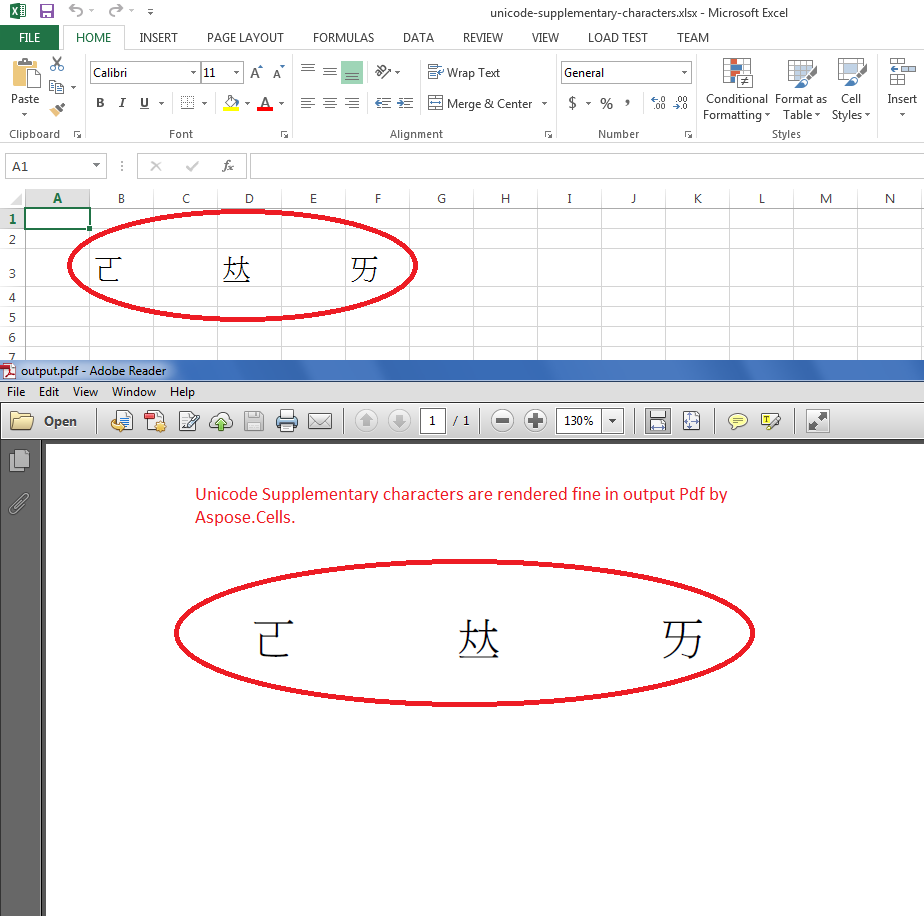 Следующий скриншот показывает, как Aspose.Cells преобразовал исходный excel-файл в выходной PDF. Как видите, все три дополненных юникодных символа были отображены точно так же, как в Microsoft Excel.