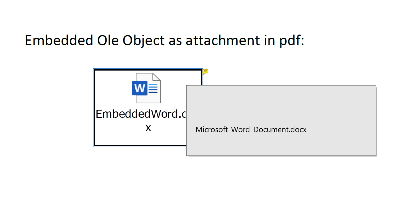 När du konverterar till PDF visas Ole Object oftast som en ikon eller miniatyrbild utan källdata. Med hjälp av egendomen PdfSaveOptions.embed_attachments kan du bädda in Ole Object:s källdata som en bilaga i PDF. Användare kan dubbelklicka på ikonen/miniatyrbilden i PDF för att komma åt den inbäddade filen.