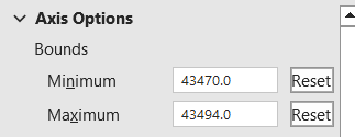 Eksen Formatını açın, X Eksenini ayarlayın ve En düşük ve en yüksek değerleri belirleyin (1/5/2019:43470, 1/30/2019:43494).
