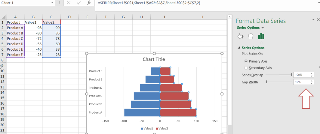 Aşağıdaki örnek kodu inceleyin. Bu kod, bazı örnek veriler içeren örnek Excel dosyasını yükler. Ardından, başlangıç verilerine dayanarak katlanmış çubuk grafik oluşturur ve ilgili özellikleri ayarlar. Son olarak, çalışma kitabını çıktı XLSX formatında kaydeder. Aşağıdaki ekran görüntüsü, Aspose.Cells for Python via .NET tarafından oluşturulan tornado grafiğinin çıktı Excel dosyasında gösterir.