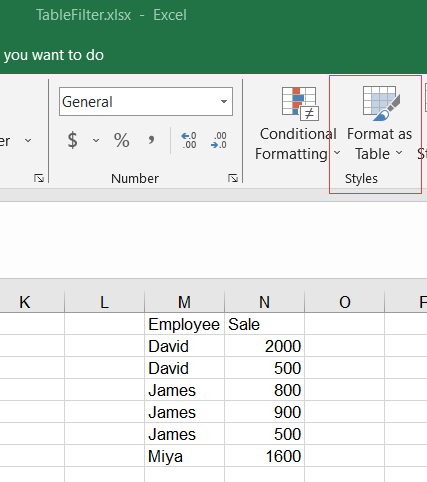 单击数据内部并使用CTRL + T或使用主页选项卡,格式为表格