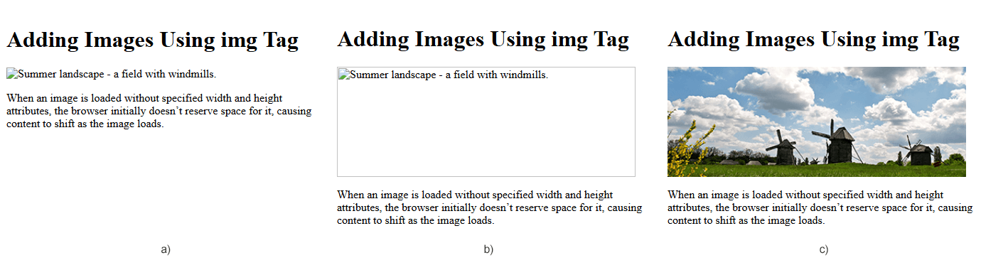 La siguiente figura muestra ejemplos de páginas web: sin espacio reservado para una imagen que aún no se ha cargado (a); el espacio está reservado en la página web para la imagen desde que se especificaron los atributos height y width en la etiqueta <img> (b); una página web con una imagen cargada (c).