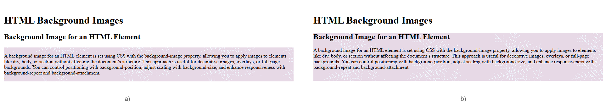 17</html>La siguiente figura muestra el resultado de renderizar los Ejemplos 1 y 2: la imagen de fondo se añade utilizando el atributo style al elemento <p> (a); la imagen de fondo se añade utilizando el elemento <style> y se aplica al elemento <div> (b).