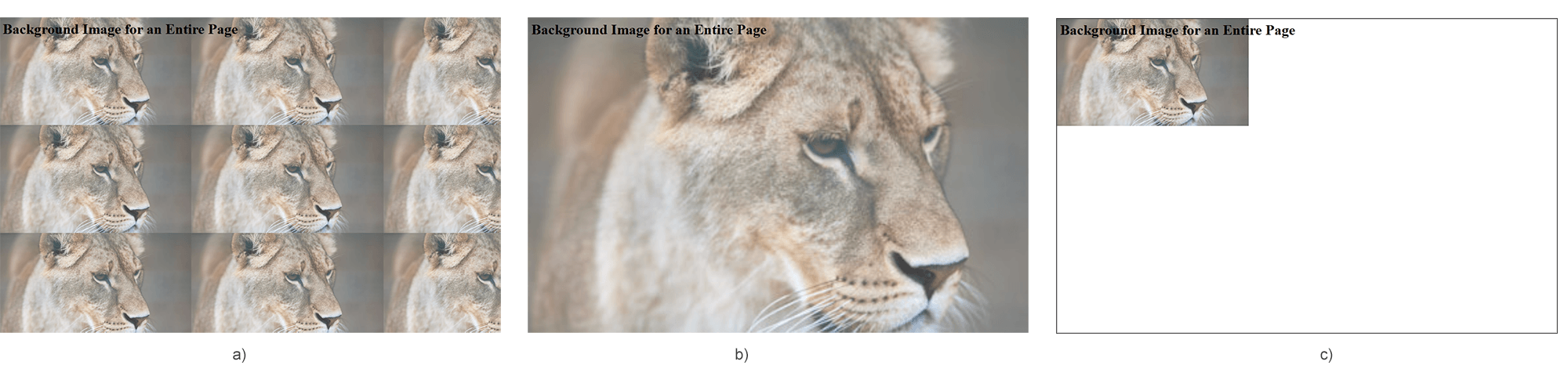 4}La siguiente figura ilustra tres pantallas de ordenador (disminuidas) con imágenes de fondo que fueron añadidas utilizando las propiedades background-image con la configuración por defecto (a), background-size: cover (b), y background-repeat: no-repeat (c):