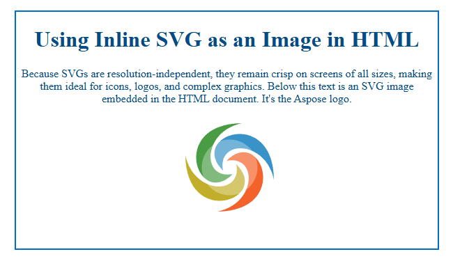 28</html>La siguiente figura ilustra el archivo HTML escrito anteriormente. El archivo utiliza un SVG incrustado, que es el logotipo de la empresa Aspose: