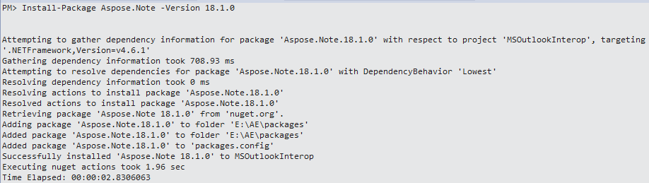 Введіть команду “Встановити -Package Aspose.note -version X.X.0” і натисніть кнопку ENTER, щоб встановити останній повний випуск у свою програму. Крім того, ви можете додати до команди суфікс “-Prerelease” “, щоб вказати, що також встановити останній випуск, що включає HotFixes.