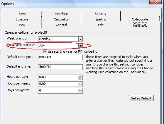 Checking that the fiscal year properties have been set in Microsoft Project.