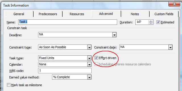 - Marque la opción “Effort Driven” o compruebe si la tarea pertenece a la ruta crítica.