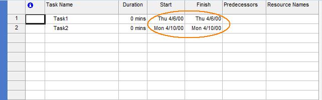 Le fichier de projet créé à partir du code ressemble à celui ci-dessous dans le projet Microsoft. Notez que les dates de début et de fin pour Task1 ont été converties du 06-APR-2010 à 06-APR-2000. De même, les dates de début et de fin de Task2 ont été converties du 10-AVR-2010 à 10-APR-2000. Ces dates sont écrites avec la même année originale si le projet est créé à l’aide d’une version licenciée d’Aspose.Tasks pour Java](3).