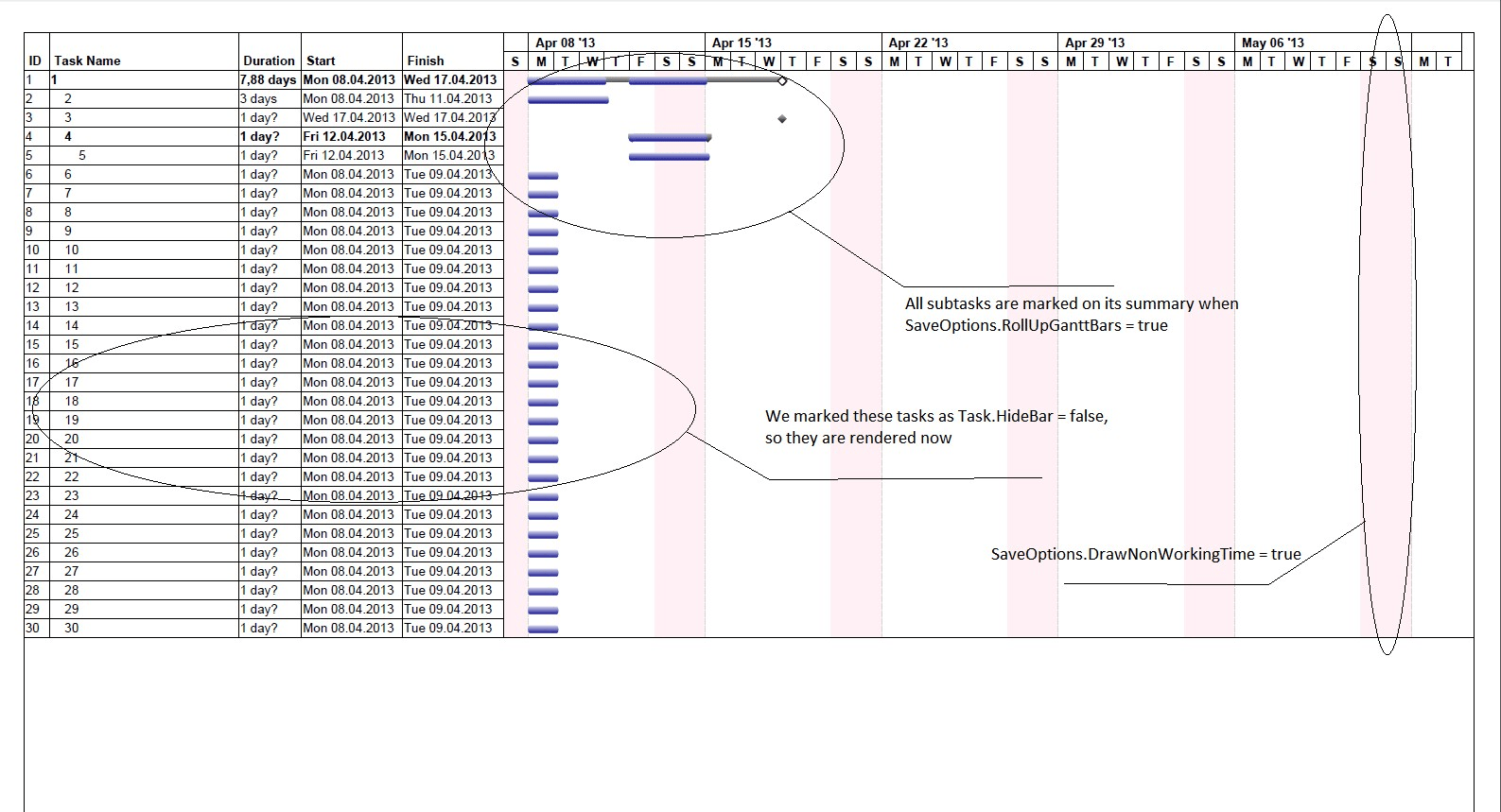 この例では、saveoptions.rollupganttbars = true、saveoptions.drawnonworkingtime = true、およびtask.hidebar =非表示のタスクのfalse。