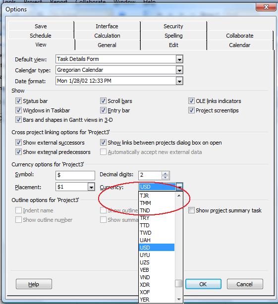 図:Microsoft Projectで通貨コードを表示および編集する。